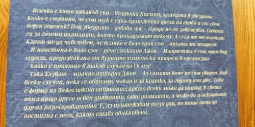 "– Всичко е като някакъв сън – въздъхна Кисмин, загледана в звездите. – Колко е странно, че съм тук с една-единствена дреха на гърба и със своя беден годеник! Под звездите – добави тя. – Преди не ги забелязвах. Смятах ги за големи диаманти, които принадлежат някому. А сега те ме плашат. Карат ме да чувствам, че всичко е било един сън – цялата ми младост.