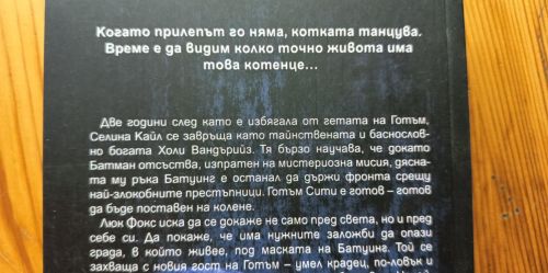 „Когато прилепът го няма, котката танцува. Време е да видим колко точно живота има това котенце… Две години след като е избягала от гетата на Готъм, Селина Кайл се завръща като тайнствената и баснословно богата Холи Вандърийз. Тя бързо научава, че докато Батман отсъства, изпратен на мистериозна мисия, дясната му ръка Батуинг е останал да държи фронта срещу най-злокобните престъпници. Готъм Сити е готов – готов да бъде поставен на колене. Люк Фокс иска да се докаже не само пред света, но и пред себе си. Да покаже, че има нужните заложби да опази града, в който живее, под маската на Батуинг. Той се захваща с новия гост на Готъм – умел крадец, по-ловък и хитър от всеки, с когото някога се е сблъсквал. Някой, който се движи в сенките, грациозен почти като… котка. Когато тя се съюзява със старите му познайници Отровната Айви и Харли Куин, хаосът заплашва да прелее отвъд границата, след която няма връщане назад. С тази Жена-котка може би си е намерил майстора.”