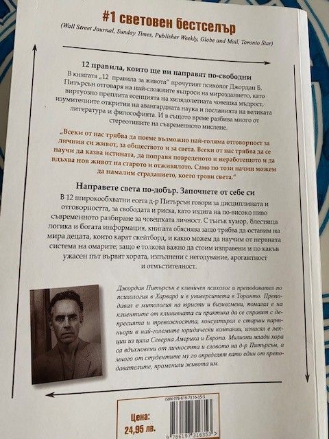 Прочутият психолог Джордан Б. Питърсън виртуозно преплита есенцията на хилядолетната човешка мъдрост, изумителните открития на авангардната наука и посланията на великата литература и философията. И в същото време разбива много от стереотипите на съвременното мислене.
